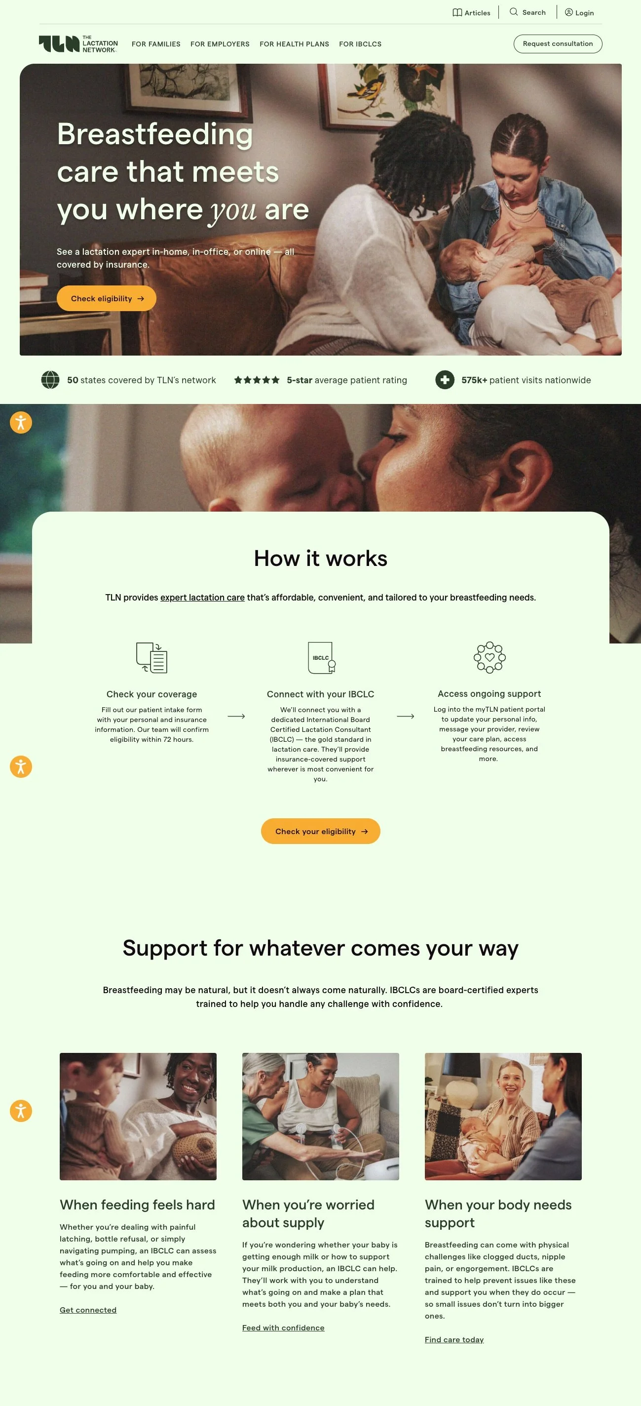 The Lactation Network (TLN) connects families to expert, insurance-covered breastfeeding care — because lactation support isn’t a luxury; it’s essential healthcare. TLN has built the largest network of IBCLCs in the U.S. and partners with health plans, providers, employers, and public spaces to make that care accessible from first latch to final wean. From campaigns and brand voice development to design refreshes and ongoing social media ideation, I lead the team responsible for bringing the TLN brand to life across every touchpoint.
